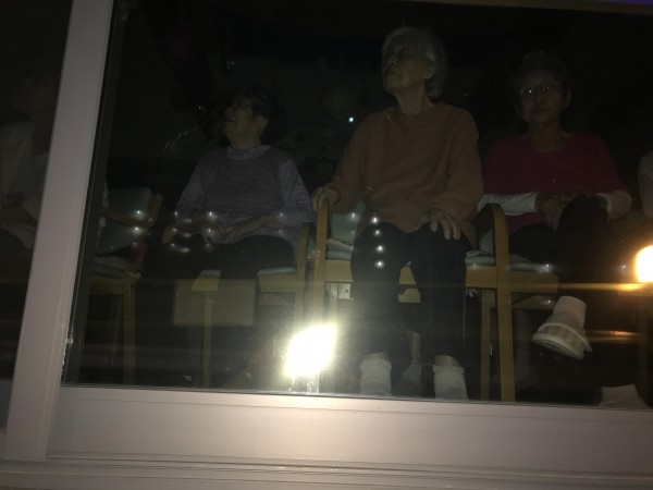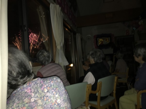 入居者の方々は、デイサービスのフロアを借りての花火鑑賞です(^^♪