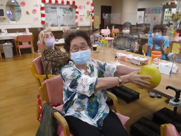 本日の午後は、ボールやセラバンドを使った介護予防運動を行いました。職員のかけ声に合わせ、皆様が一斉に体を動かす姿はとても活気があります。