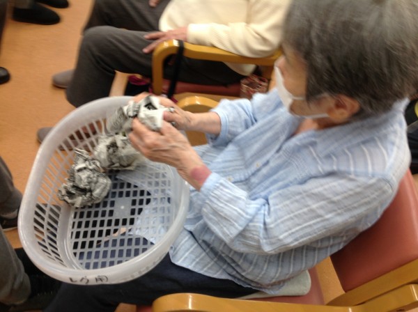 後半は「おにぎり丸めゲーム」。くしゃくしゃにして丸めていきます。1人3つ作ります