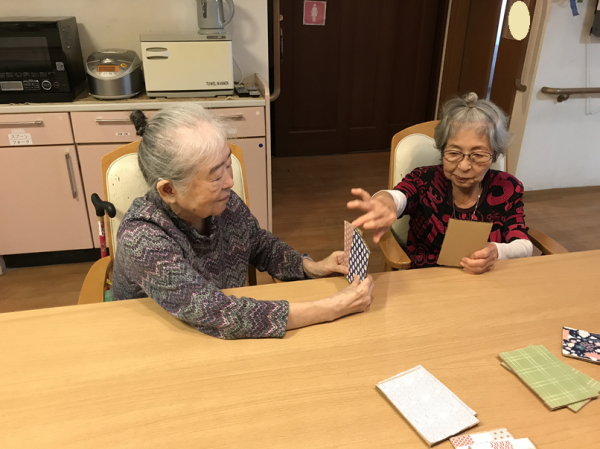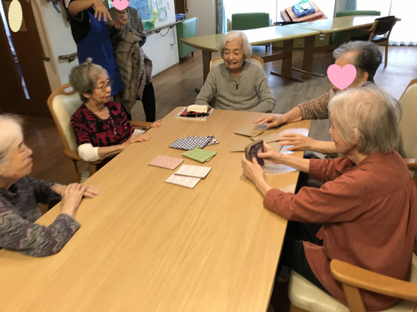 段ボールに柄付きの折り紙を貼って作ったカードを使って