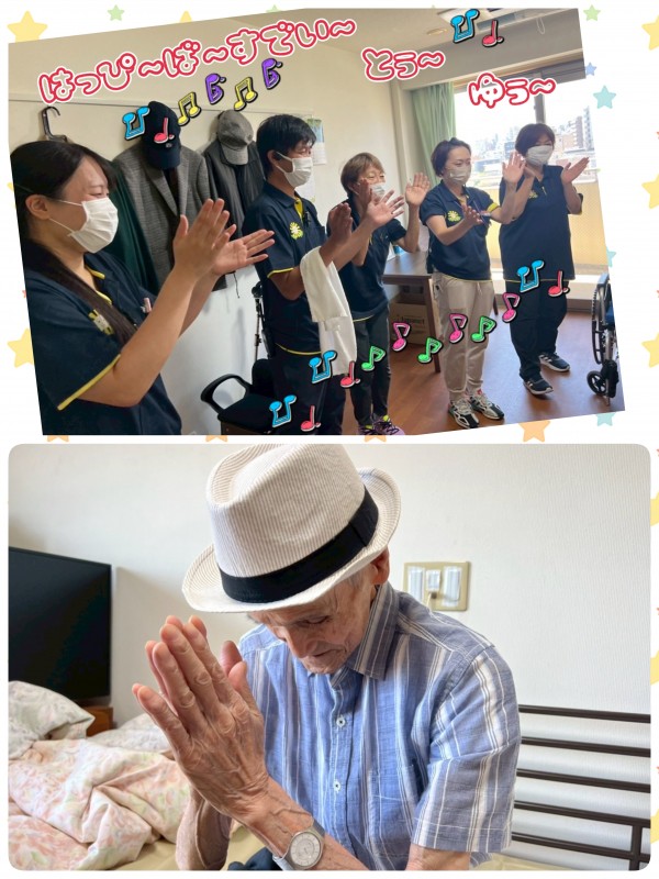 お部屋に押しかける職員たち!そして、ハッピーバースデイ♪の大合唱。「ありがとう、ありがとう」と手を合わせるダンディ様。