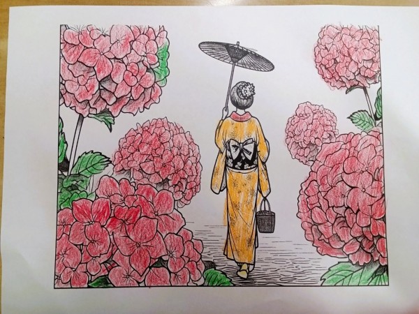 いつも真面目なY様の作品あじさいの色が統一されてて女性の着物がとっても映えてます素敵