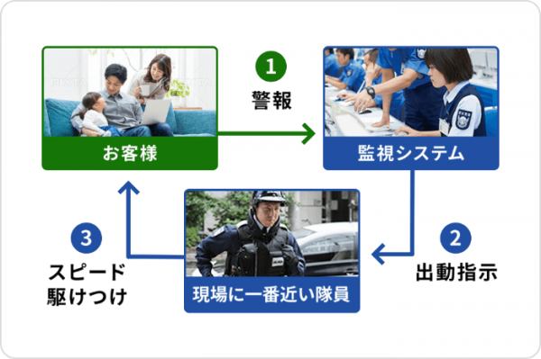 一定時間反応がない場合は、異常があったと判断してガードマンが駆けつけてくれます。