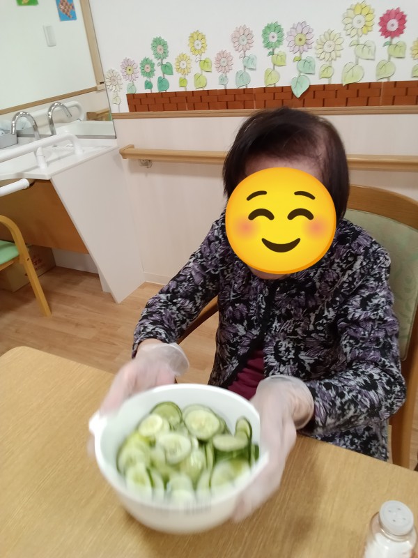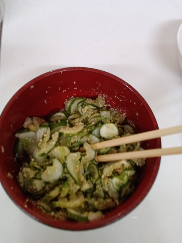 しっかり塩もみして、ちょっとお味見、うん、いい塩梅ね(◠‿・)—☆