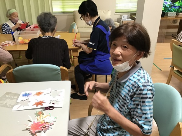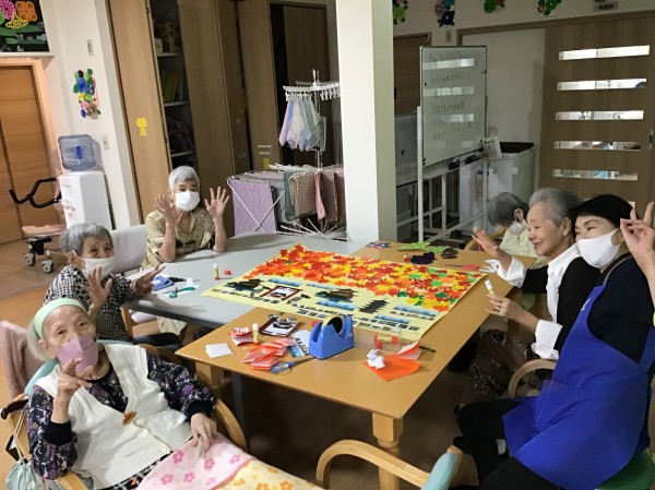 そこでかたくりでは一足早く秋を楽しめるようにとクラフト活動で紅葉の景色を作りました。