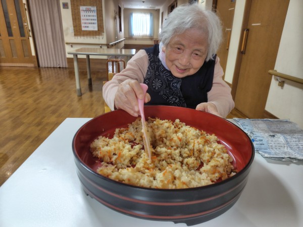 各ご利用者様の座席へと行き皆様にしゃもじを持っていただき混ぜていただきました。