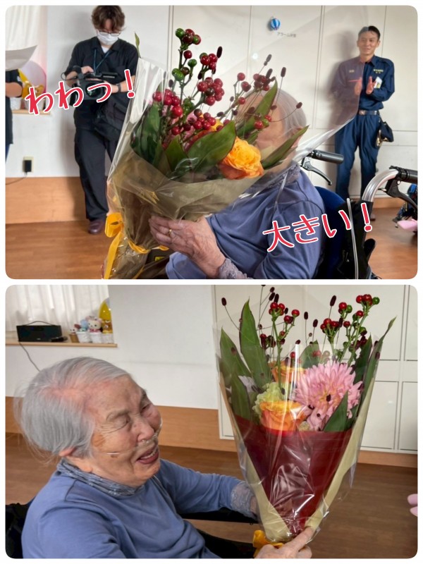 そして、顔が隠れるほどの大きな大きな花束をしっかりと受け取られ、感無量の101歳様。