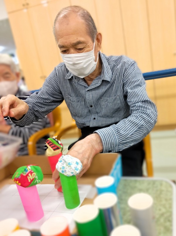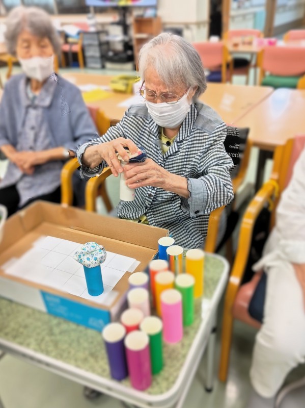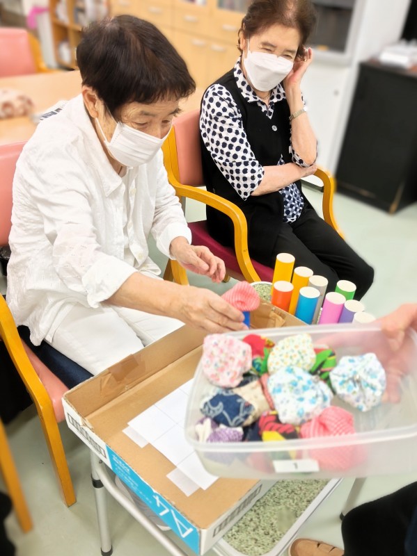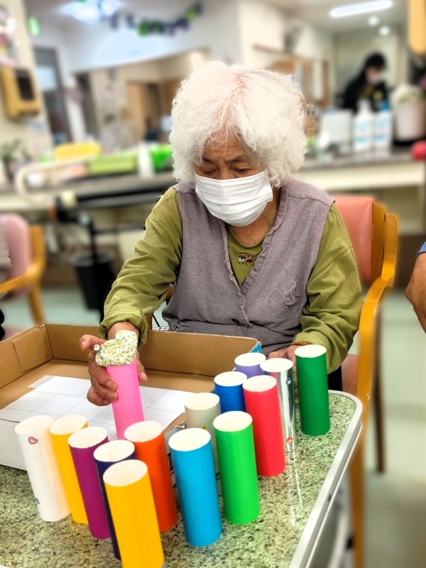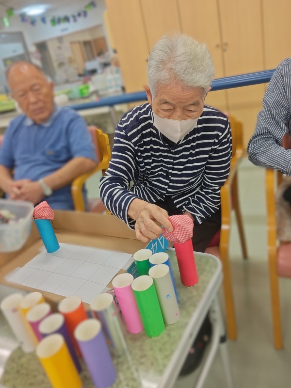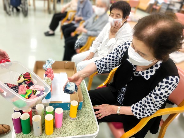 制限時間内にお手玉を乗せたペーパー芯をマス目に並べていくというもの。