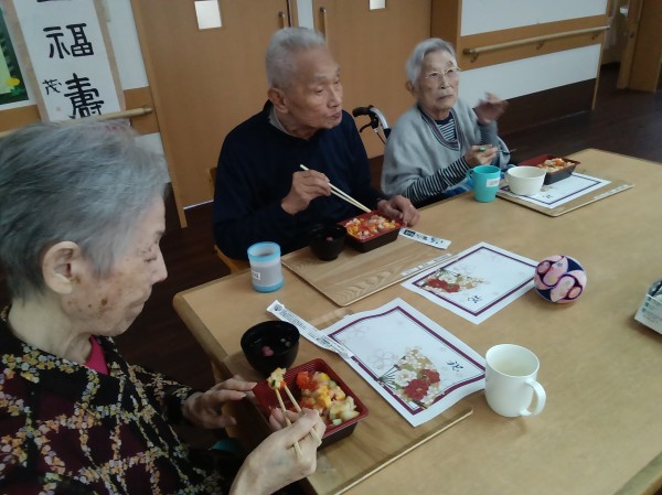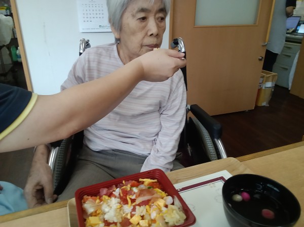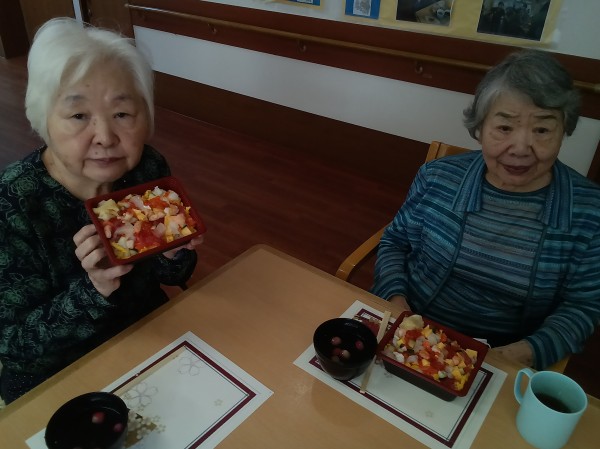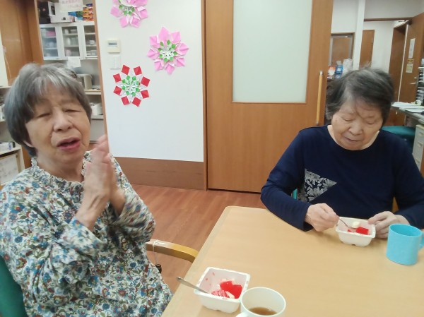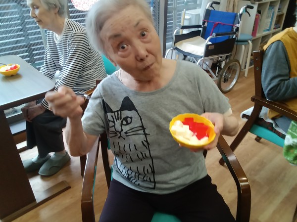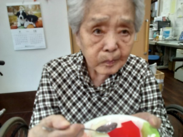 おやつにはスタッフ手作りの紅白ゼリーを召し上がって頂きましたが、こちらも『甘くて美味しい~』と、みなさんペロリとたいらげていました(^^)/作ったスタッフも嬉しい限りです(^○^)