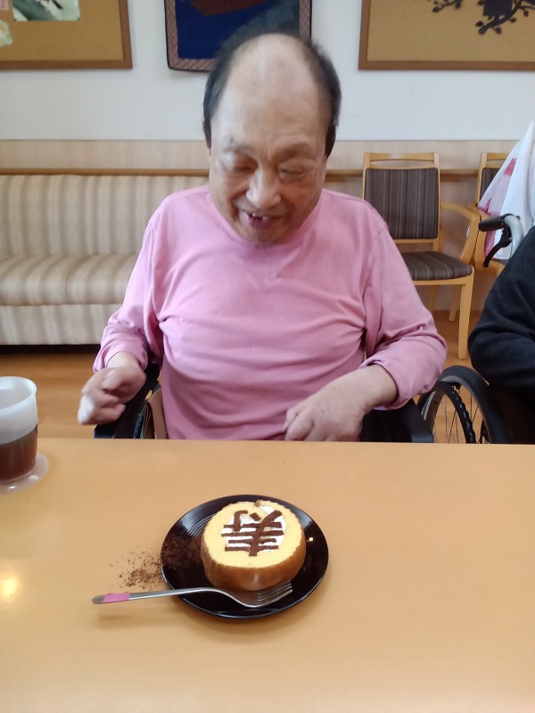 ロールケーキに「寿」の文字を自分で入れるおやつレクを計画しました(^^♪