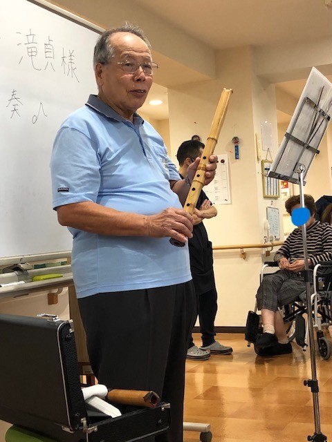 実は尺八演奏のTさんは、わたしがグループホーム横浜綱島の管理者をしていたころからのお付き合いになります。毎月2階、ユニット毎に演奏してくれていました。ヨコハマシボランティア制度の会員様で綱島も登録事業所でした!(・ω・)やったね!今回は初めてということで緊張していました今までは9名の前での演奏ですが