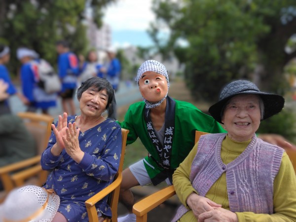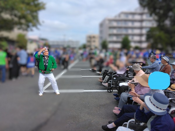 先日、地域のお祭りがありました。当ホームにもおみこしやひょっとこ等が回ってきました♪