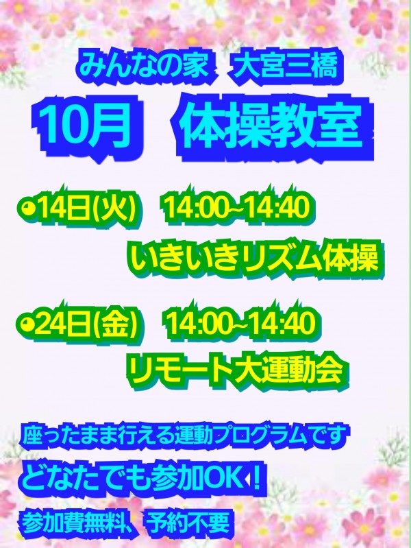 グループホームみんなの家大宮三橋 みんな集まれ~!10月体操教室のお知らせで~す!!