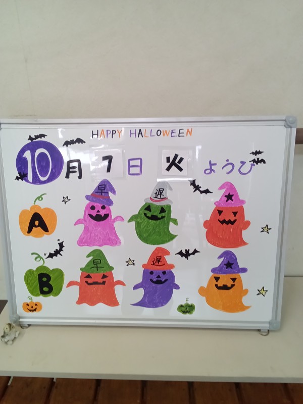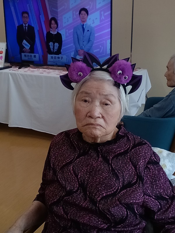 本日はハロウィーンの準備をしていて被り物を出してみるとご入居者様から被り物を見て被りたいと要望がありハロウィーンではないのですが、被ることで皆が盛り上がってしまいご入居者様とハイポーズで写真を撮ってみました。