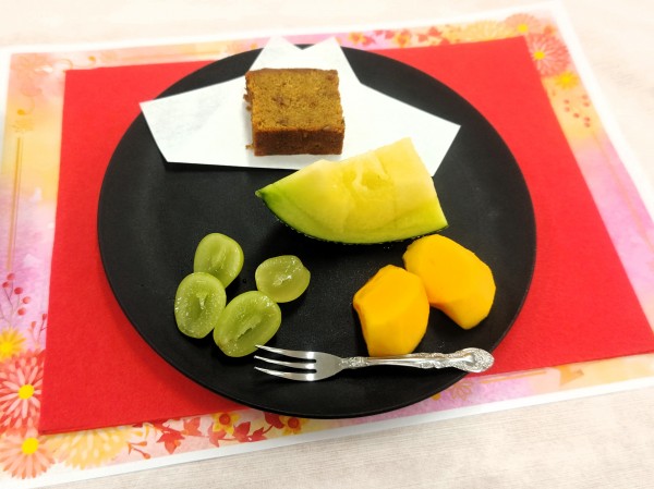 フルーツの盛り合わせとキャラメルバナナケーキプレートに宇治かぶせ茶をご用意♪