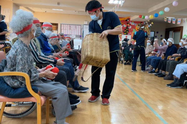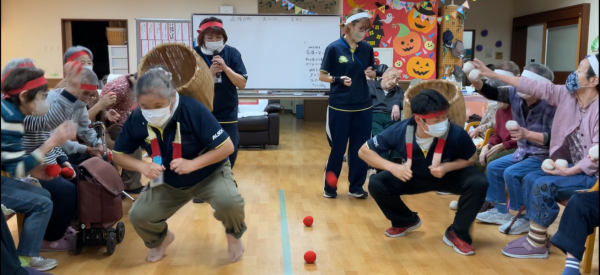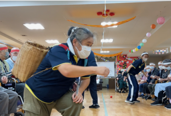 まずは元気いっぱいの応援合戦でスタート!続いての玉入れでは職員の背負ったかごをめがけて次々と玉が飛び交い、白熱した勝負となりました。