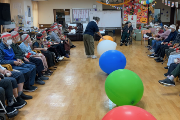 そして最後は大盛り上がりの風船当てゲーム!真ん中に置いた大きな風船を、球を投げて相手陣地に押し込むというユニークな競技です。皆様の力強い一投ごとに歓声が上がり、それは熱い熱い戦いになりました。