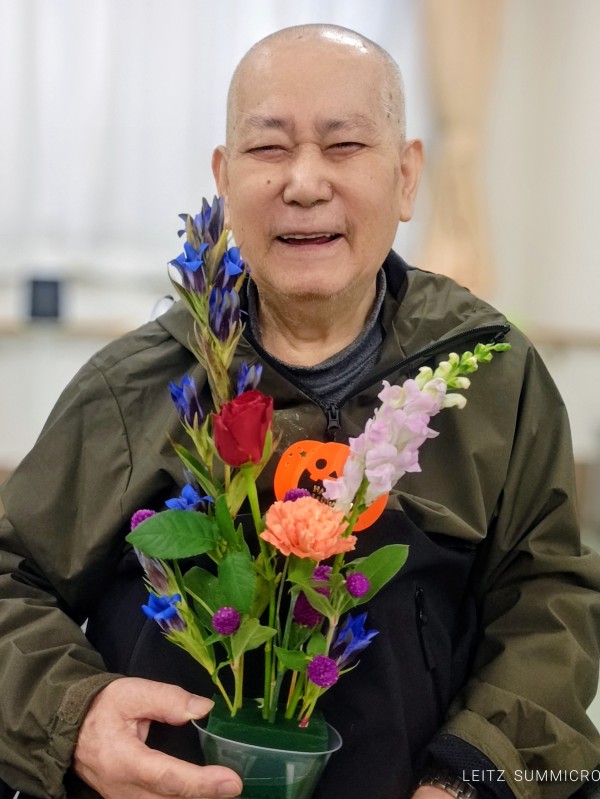 竜胆や千日紅、金魚草にバラ、そしてヤツデの葉を花材に