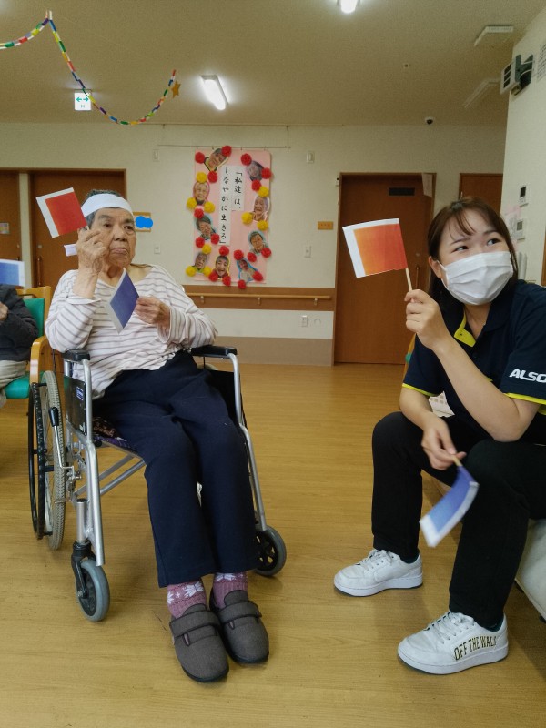 運動・トレーナーの指示通りに旗を上げ下げし