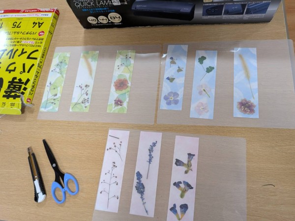 皆さんが選んだ花をしおりに乗せてラミネートをかけます。