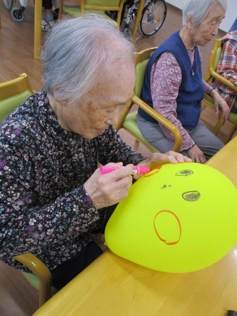 風船遊びを行っています( ^ω^)・・・ 先ずはじめに風船に顔の絵を書きました。風船????遊びを行いました(*^_^*)
