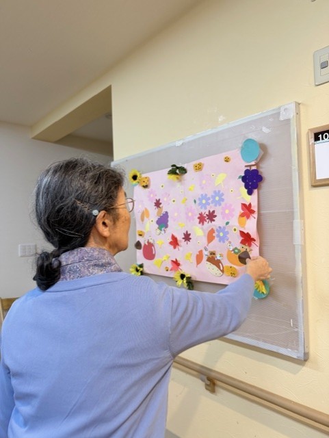 みんなが良く見えるようにとテレビの周りに季節の飾りをしました。壁絵にも貼りました。