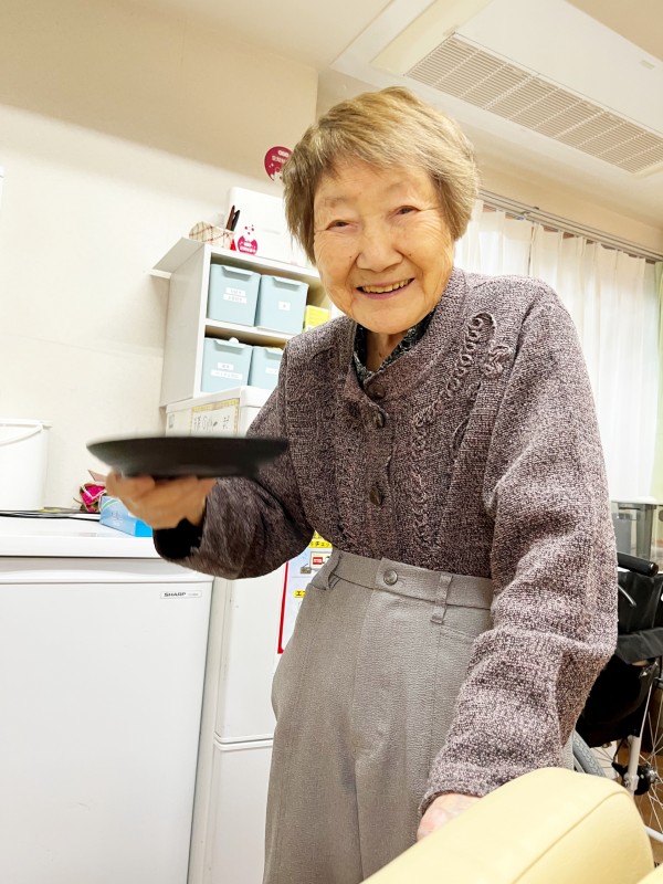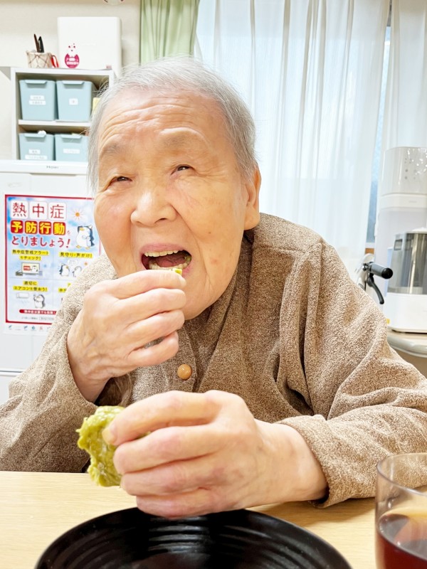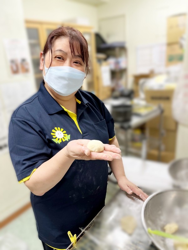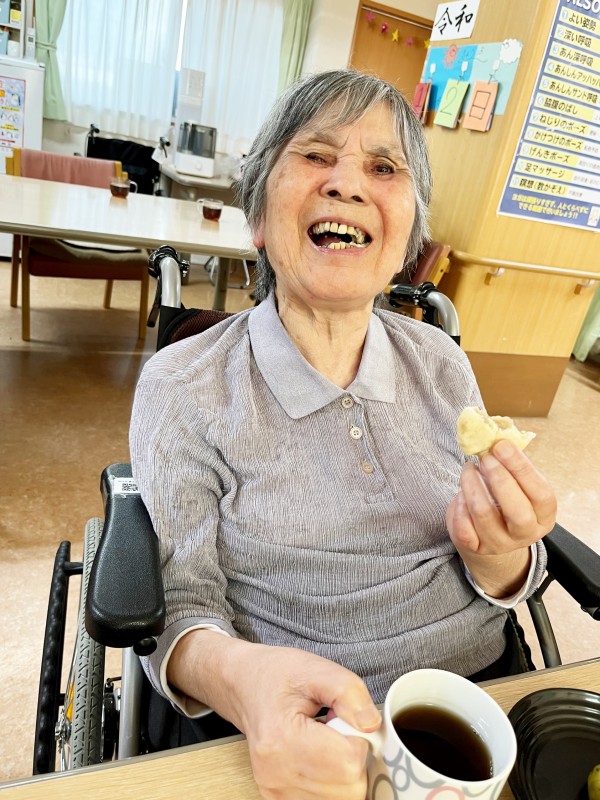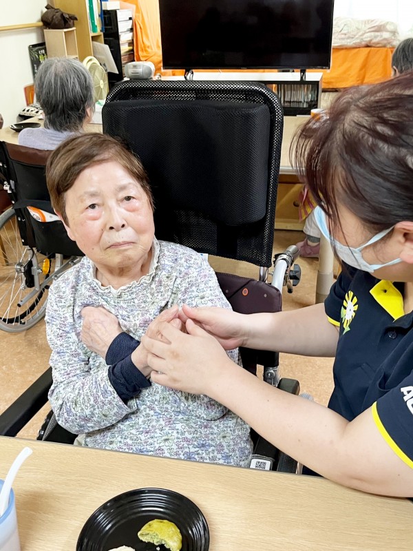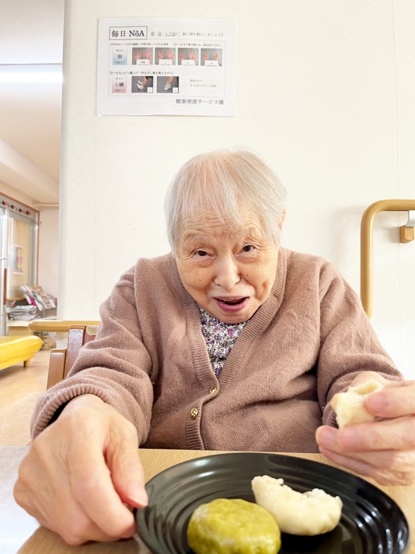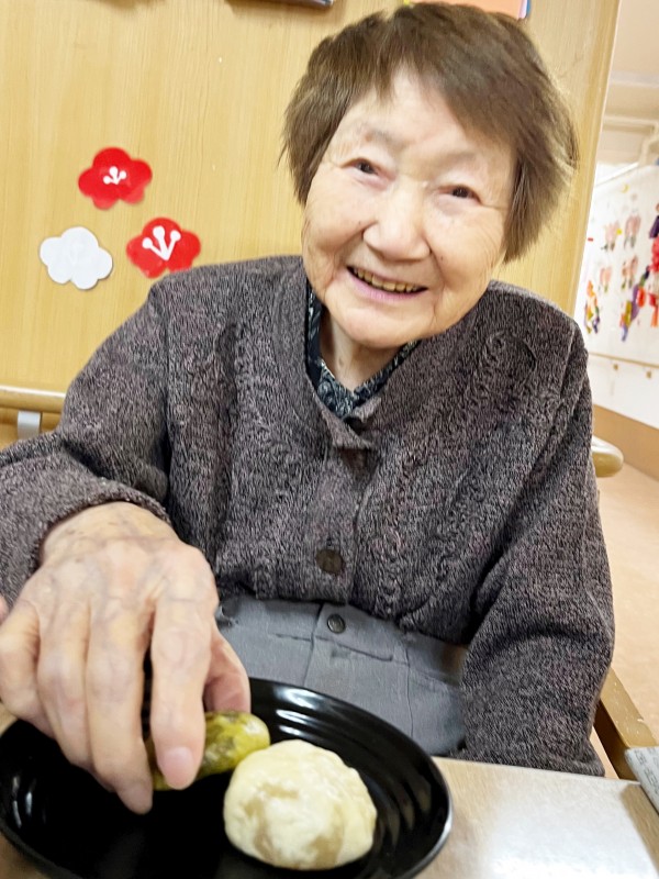 昼食の介助中、目を閉じてしまいなかなか食事が進まなかったS子様にホーム長が「今ね、美味しいお饅頭を頑張って作っているから、S子さんも頑張ってお昼ご飯食べようね」と声をかけると、S子はぱっと目を開けて「わかりました!」と元気なお返事。その様子に職員一同、思わず笑顔になりました。