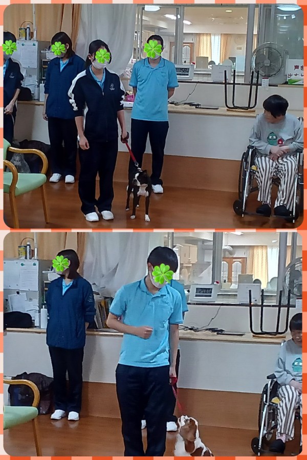 触れ合いコーナーでは生徒さんがワンちゃん達を近くまで連れてきて膝の上にのせて下さいます