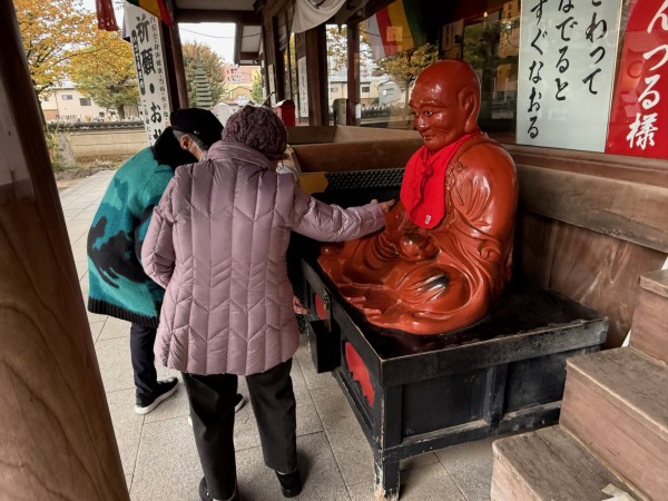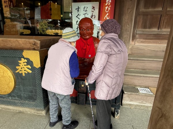 おびんずる様は、お釈迦様のお弟子様のひとりで、病気に苦しむ人々を救ったと伝えられている方です。そのため、昔から「自分の悪い部分と同じところを撫でると、良くなる」と信じられ、多くの参拝者に大切にされています。