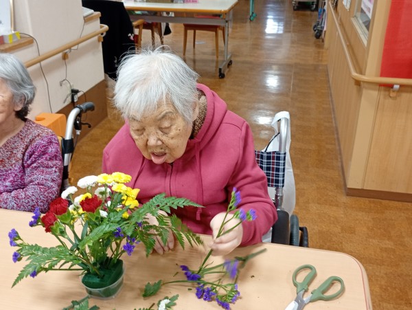 今回は、毎月恒例の1Fデイサービスと合同でフラワーアレンジメントを行ったので