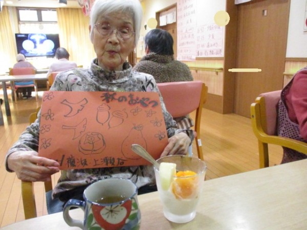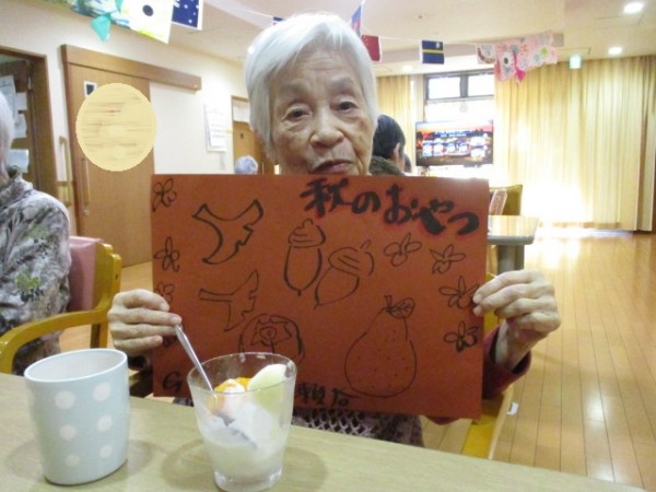 食欲の秋 本日のおやつ職員手作りパフェ皆さんの美味しい笑顔ご覧ください。