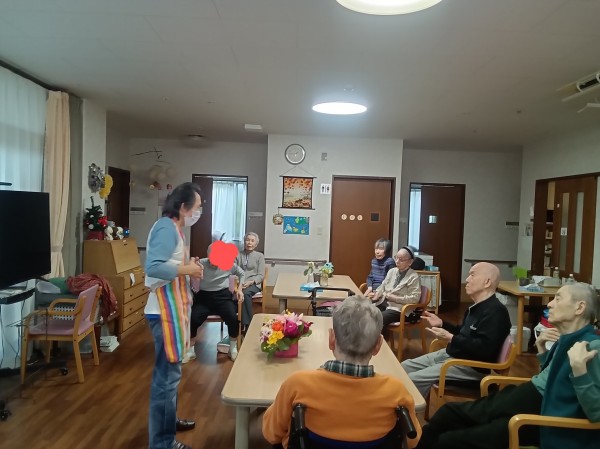 今回はボランティアさんと交流したときのおはなしなのです。月に2回来訪されご利用者様と一緒に過ごされてレクリエーションをしてくださっています。常に新しいレクリエーションを見ては楽しい日を過ごしています。