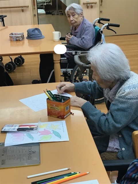 今回のテーマは紅葉ということでまずは、イチョウや落ち葉の型紙に塗り絵をしてもらいました(/・ω・)/
