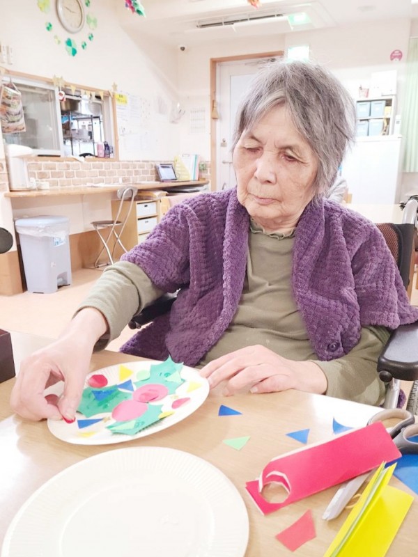 「どこに貼ればいいの?」と確認しながら、パーツにご自身で丁寧に糊を付けて真剣に貼り付けておられました。職員に「きれいにできましたね」と声をかけられると、照れたように「いやいやいや…」と微笑ましい反応をされていました。