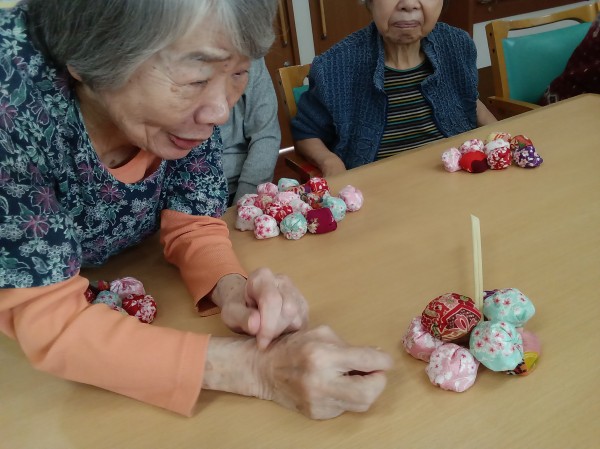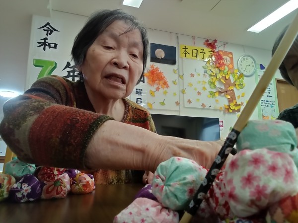 昔は五つ位は出来たのにー。や、小さいからやりにくい…などと言いながらも、皆さん上手にお手玉をされていました(*^-^*)