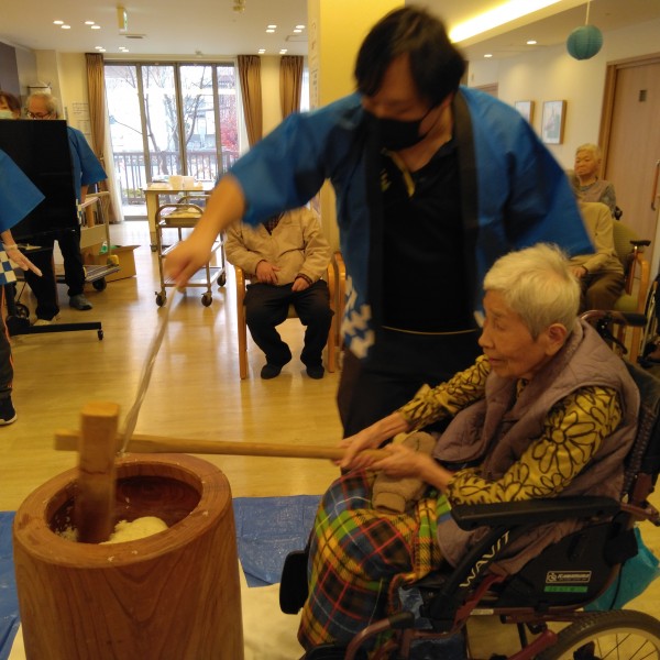 最初は少しこねる為にホーム長と男性スタッフでつき始めました 大きな音が響きます