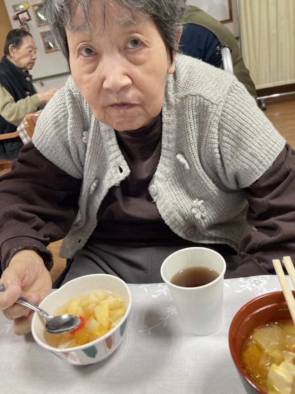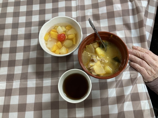 けんちん汁にフルーツポンチ、野菜に果物でビタミン補給で風邪対策。