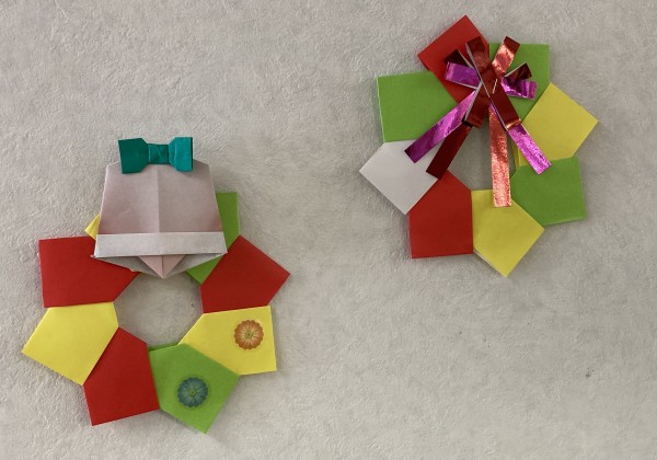 折り紙でクリスマスリースを作ります。