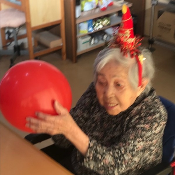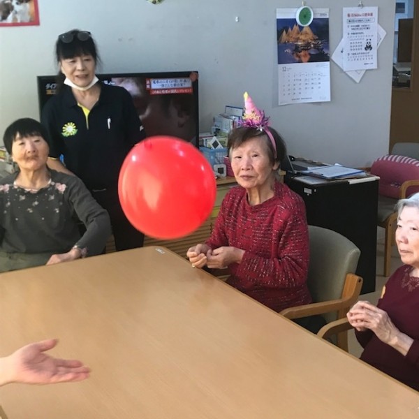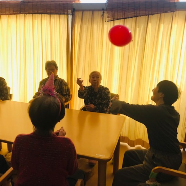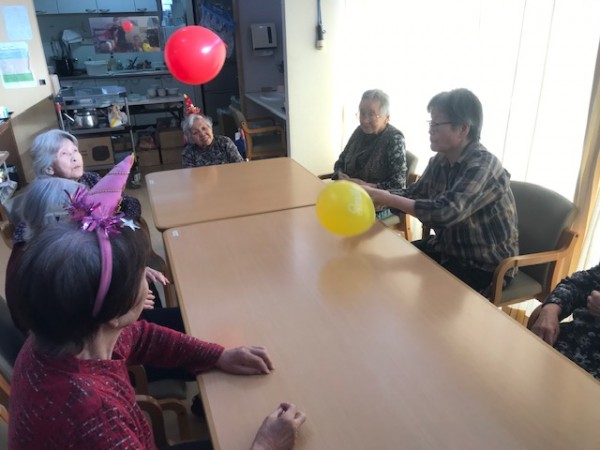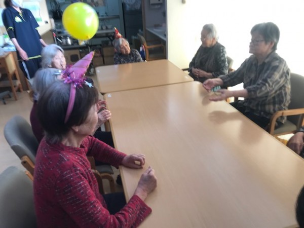 ケーキでお祝いする前に風船運びのレクリエーションを始めましょう!