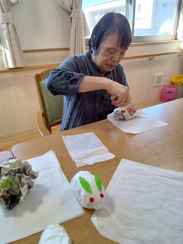 新聞紙とお花紙で雪うさぎを作っています♪