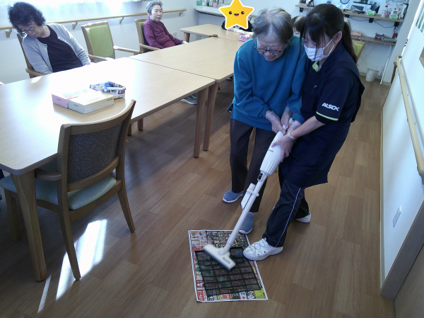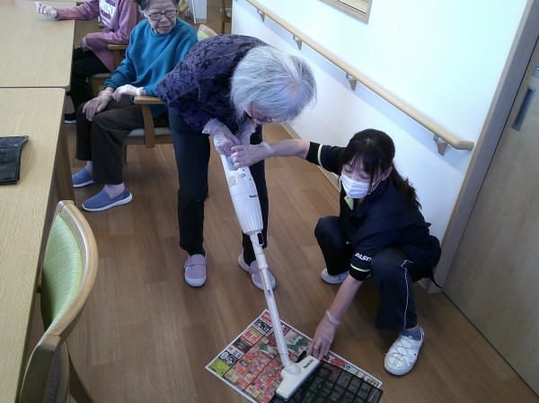 ごみ捨て、手すり拭きや床のモップかけ、フロアと廊下の掃き掃除など、日々のお掃除も職員見守りや付き添いのもと、無理のない範囲で分担して皆さんで協力して行なってくださっています。