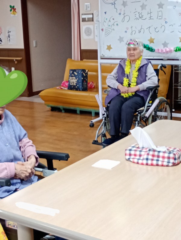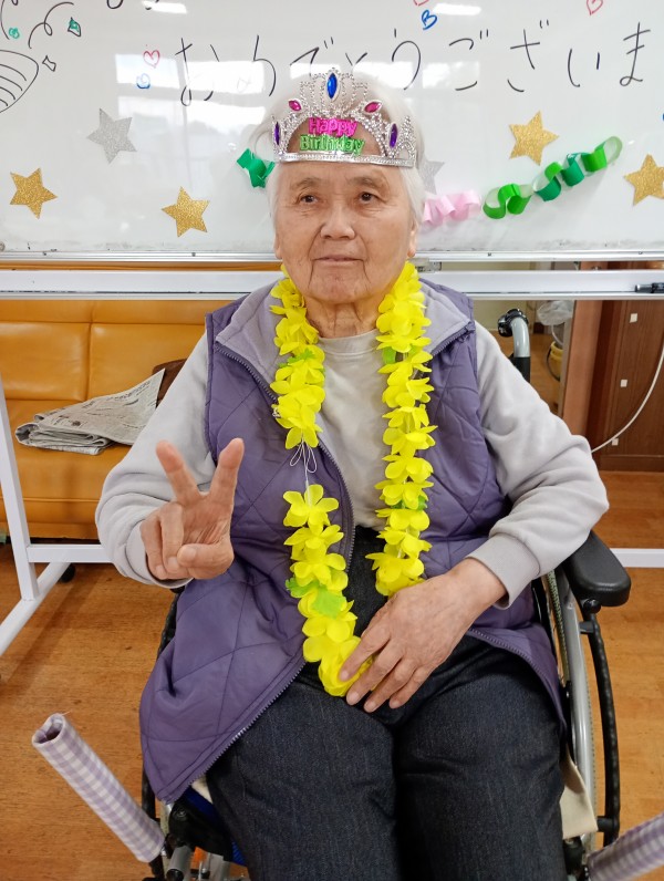 12月のお誕生日の利用者様は1名でした。お花の首飾りをかけ頭にはティアラをかぶりとてもかわいく♪写真が撮れました。