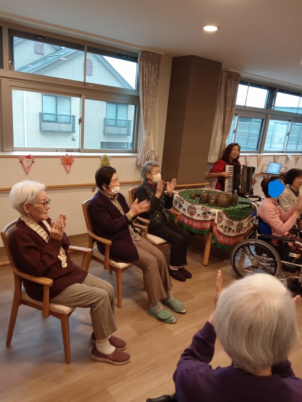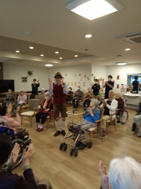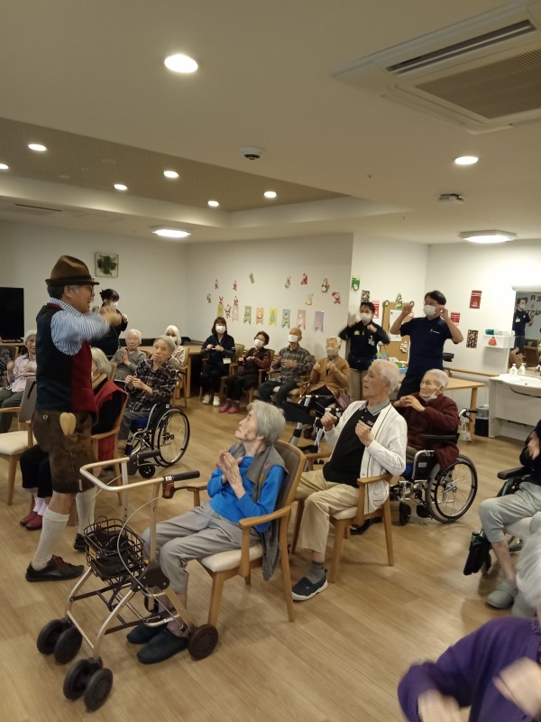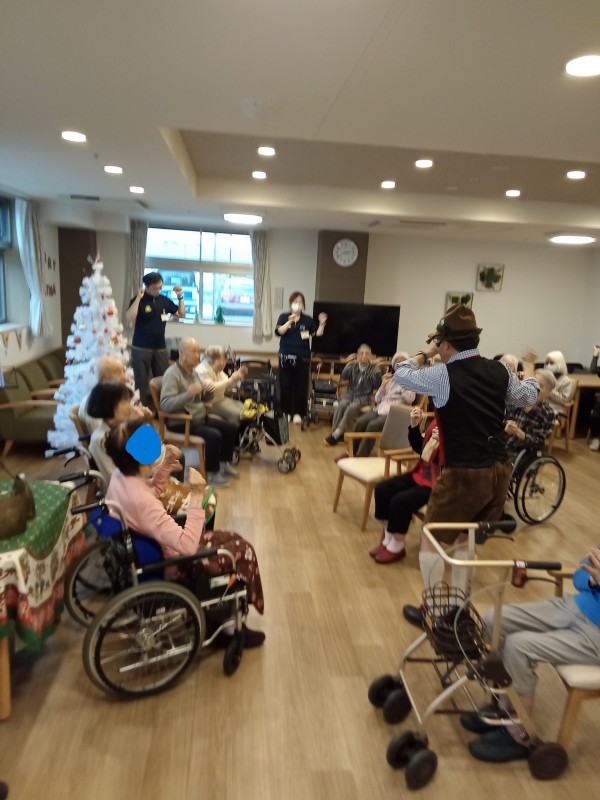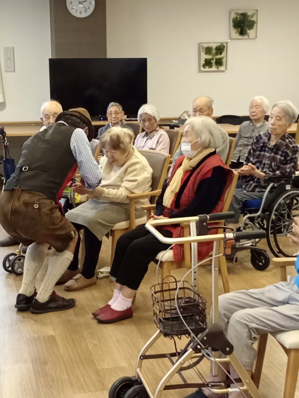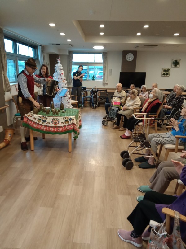 アルプホルンはとても長い楽器で、入居者様も職員も興味津々でした。