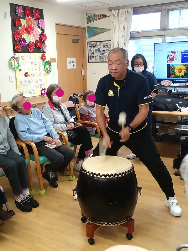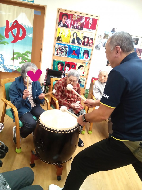 利用者の皆様は、365歩のマーチの歌に合わせて太鼓を打ちました。リズミカルな歌なのでノリノリで楽しそうでした。(^^)