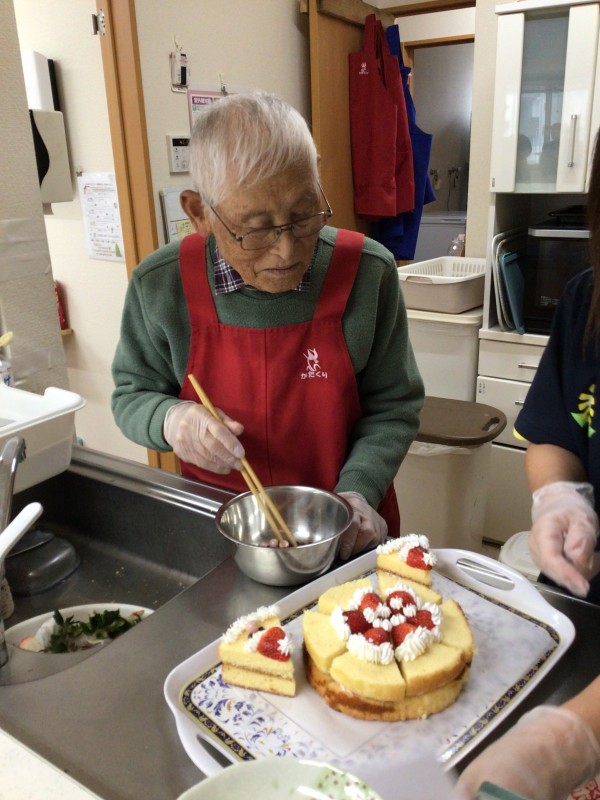 今日もご利用者様に手伝って頂きながらサンタのケーキを作りましたよ!