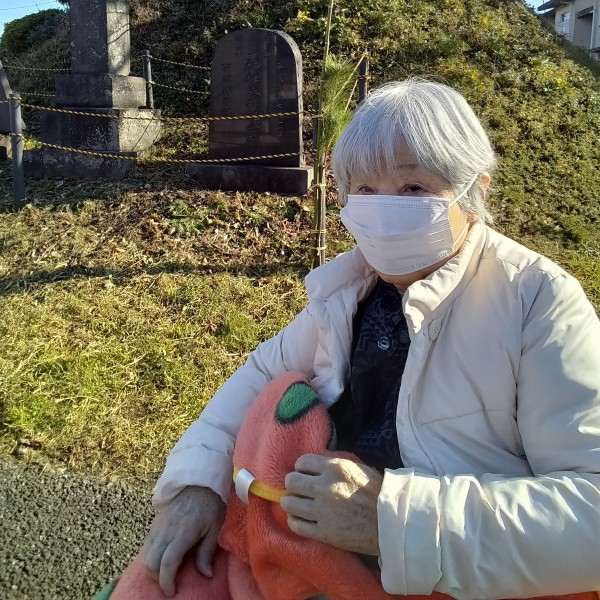 ホーム内はご自分で歩いておられますが、神社まで距離があるので車椅子で向かいます。