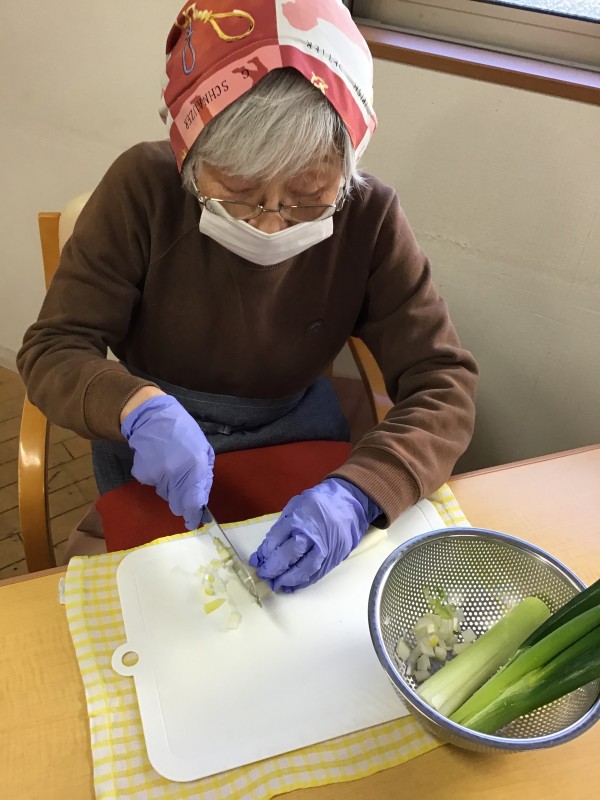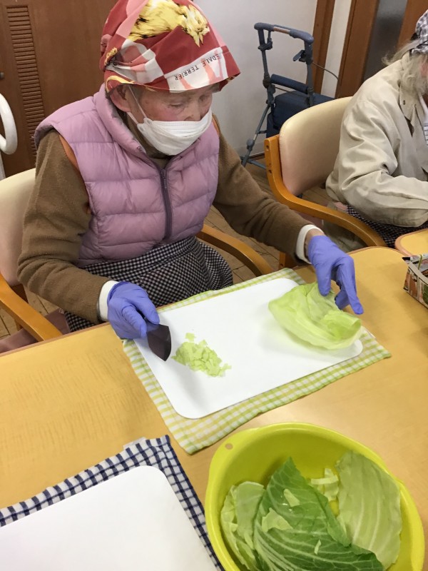利用者さん達が包丁を持ち、お野菜を切ったり、お肉を丸めたり、、、