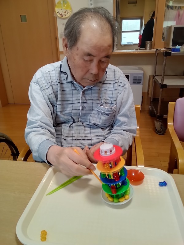 もうひとつのゲームは、箸で豆などをつまんでタワーにのせます。