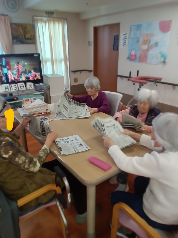 以前のブログでは洗濯物たたみと床のお掃除をご紹介しましたが、今回は新聞紙の折りたたみをご利用者の皆さんにお願いいたしました。それではその時の様子をご覧ください(^^♪