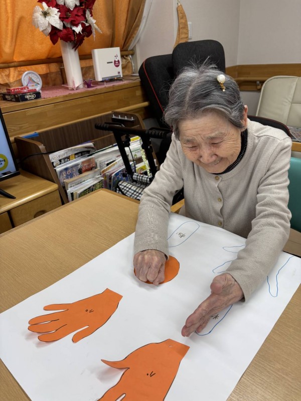 みんなの家・川越寺尾です☆ブログをご覧いただきありがとうございます!ぺったんこの手形を使ったレクリエーションを行いました!